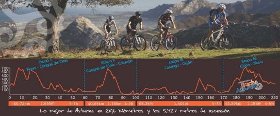 Descripción: Iniciamos las ruta con la subirá a las Praeres (final de la Vuelta a España) terreno ciclable a pesar de las rampas duras, a continuación bajamos por el Camino de Covadonga, desvío para iniciar la segunda subida, técnica y de piedra suelta, vistas más bonitas de la primera etapa en la bajada que nos lleva hasta Infiesto.